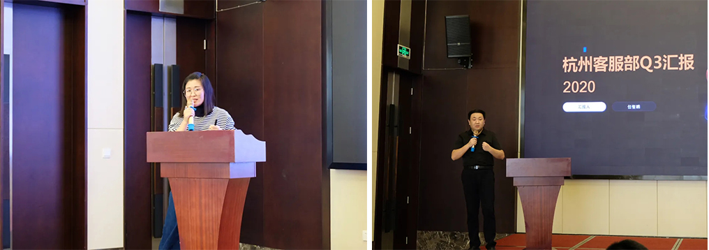 接下來(lái),南京首屏副總經(jīng)理高娜、杭州客服部總監(jiān)任智鵬分別針對(duì)南京、杭州客服業(yè)務(wù)開(kāi)展工作匯報(bào),深度剖析Q3工作成果、分析總結(jié)存在的問(wèn)題和難點(diǎn),并對(duì)Q4的工作重心進(jìn)行詳細(xì)規(guī)劃。
