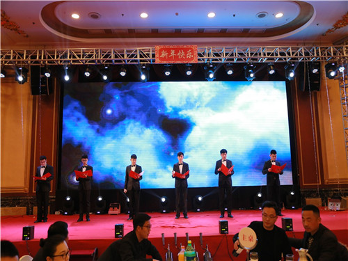 頒獎(jiǎng)典禮后政總上臺(tái)為本次的新春年會(huì)致祝酒詞,政總期望大家在新的一年工作可以更上一層樓,生活可以和和睦睦。最后全場(chǎng)跟隨政總一起舉起酒杯,將杯中酒一飲而盡,年會(huì)的表演環(huán)節(jié)正式開始。
