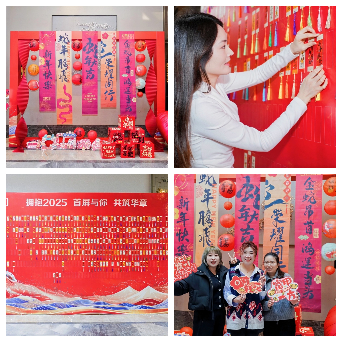 “平安喜樂(lè)”、“多財(cái)多億”、“諸事皆宜”等各色國(guó)風(fēng)箋條掛滿簽到墻,大家紛紛寫(xiě)上祝福語(yǔ),祈愿新年都有好運(yùn)勢(shì)。另一邊,精致的新年打卡區(qū)吸引了伙伴們的目光,擺起Pose來(lái)上新年第一拍。
